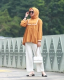 variasi renda di bagian dada dan di pergelangan tangan membuat look blouse ini terlihat cute